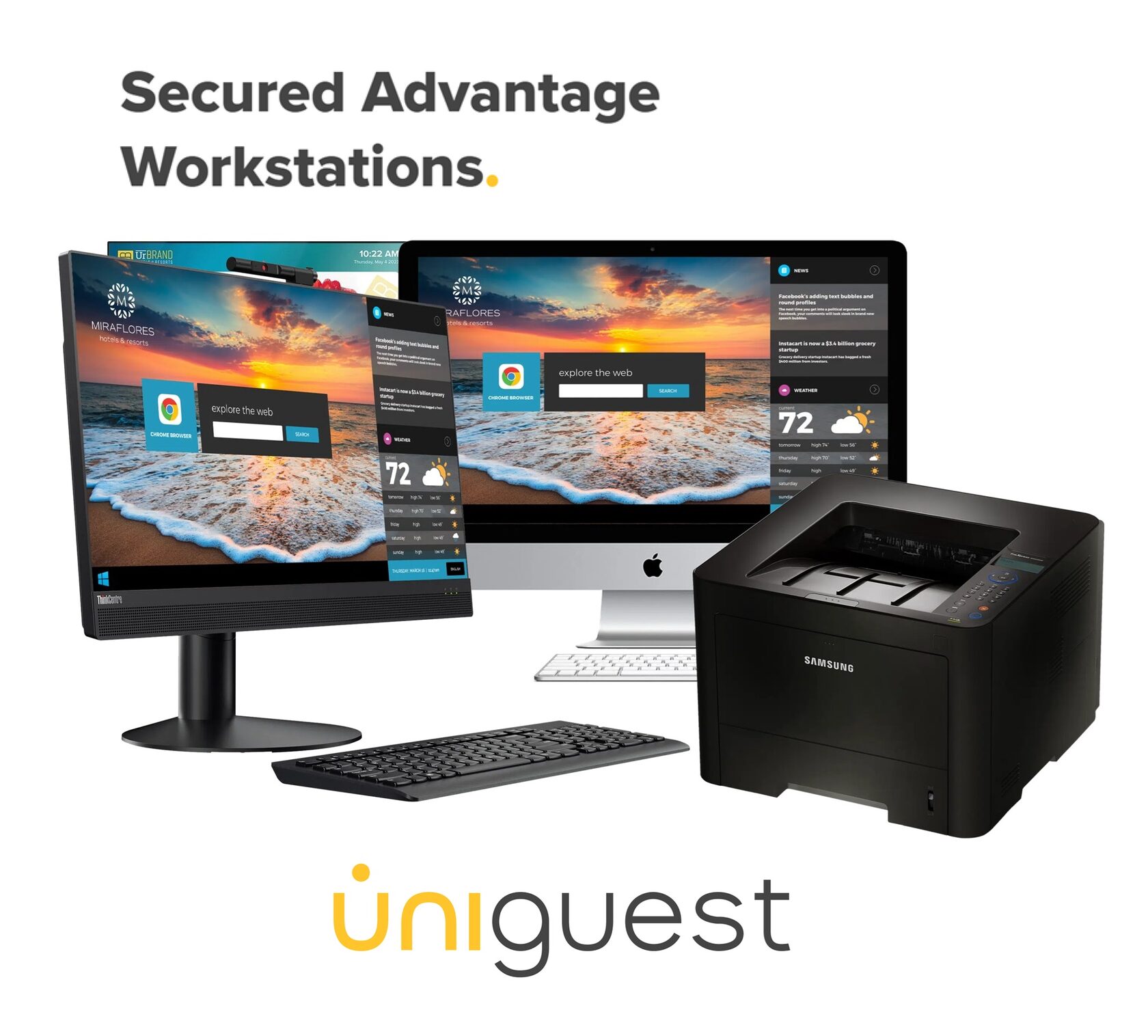 Public-use workstations, open lobby PCs, and tablets that offer a familiar computing experience for guests and staff, with advanced cybersecurity to protect your property and the ability to act as digital signage displays when not in use.